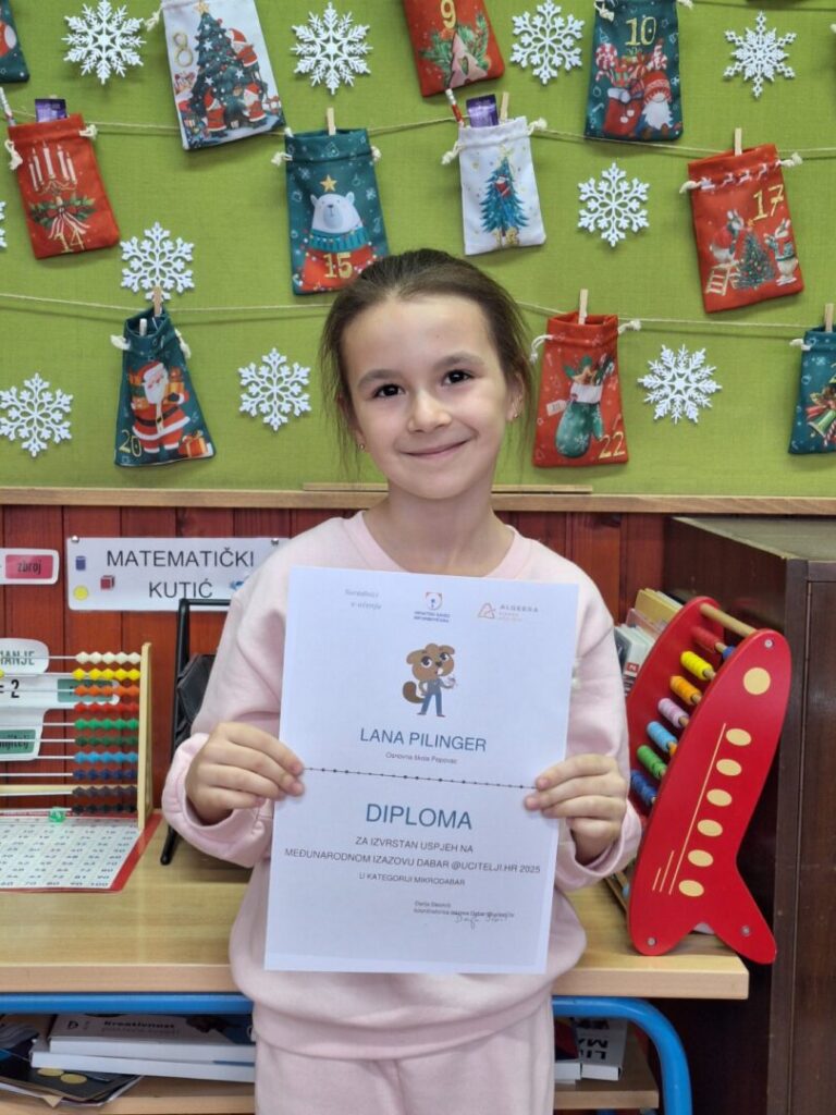 Među 10% najuspješnijih učenika u Hrvatskoj našla se Lana Pilinger, koja je točno riješila svih 12 zadataka. Čestitamo Lani na ovom izvanrednom rezultatu!
